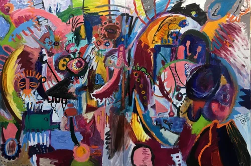 Fische, Augen, Häuser, Treppen, Brüste, Hände, Köpfe, Penisse und immer wieder viel von dieser leckeren Farbe. Es sind die gleichen Symbole in der Bildsprache, die ich schon als Kind wählte. Freiheit und selbstgewählte Grenze. Die Fortführung der Bildsprache gibt Sicherheit und Vertrauen. Jedes Bild,